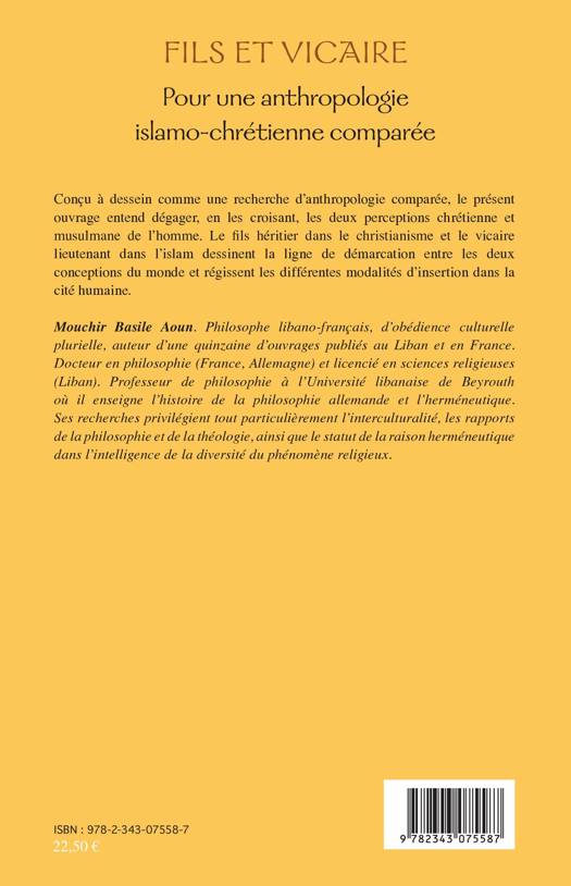 Conçu à dessein comme une recherche d'anthropologie comparée, le présent ouvrage entend dégager, en les croisant, les deux perceptions chrétienne et musulmane de l'homme. Le fils héritier dans le christianisme et le vicaire lieutenant dans l'islam dessinent la ligne de démarcation entre les deux conceptions du monde et régissent les différentes modalités d'insertion dans la cité humaine.