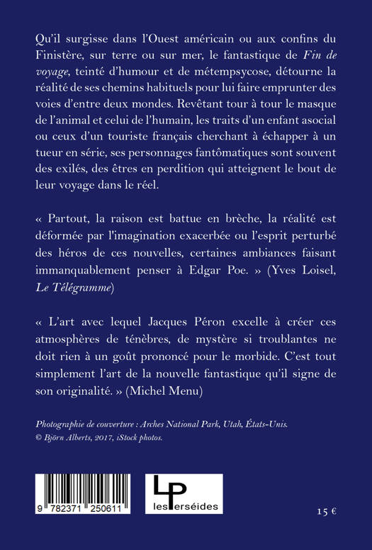 Qu’il surgisse dans l’Ouest américain ou aux confins du Finistère, sur terre ou sur mer, le fantastique de Fin de voyage, teinté d’humour et de métempsycose, détourne la réalité de ses chemins habituels pour lui faire emprunter des voies d’entre deux mondes. Revêtant tour à tour le masque de l’animal et celui de l’humain, les traits d’un enfant asocial ou ceux d’un touriste français cherchant à échapper à un tueur en série, ses personnages fantômatiques sont souvent des exilés, des êtres en perdition qui atteignent le bout de leur voyage dans le réel.