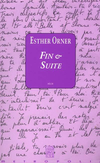 Dans Autobiographie de Personne, un premier roman paru en 1999, salué par la critique, Esther Orner donnait la plume à sa mère. Fin et Suite redonne la parole à l'auteure pour clore en quelque sorte le chapitre mère-fille.