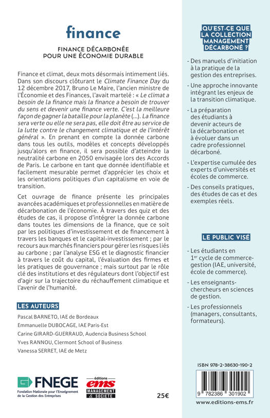 Cet ouvrage de finance présente les principales avancées académiques et professionnelles en matière de décarbonation de l’économie. À travers des quiz et des études de cas, il propose d’intégrer la donnée carbone dans toutes les dimensions de la finance, que ce soit par les politiques d’investissement et de financement à travers les banques et le capital-investissement ; par le recours aux marchés financiers pour gérer les risques liés au carbone ; par l’analyse ESG et le diagnostic financier à travers le coût du capital, l’évaluation des firmes et les pratiques de gouvernance ; mais surtout par le rôle clé des institutions et des régulateurs dont l’objectif est d’agir sur la trajectoire du réchauffement climatique et l’avenir de l’humanité.