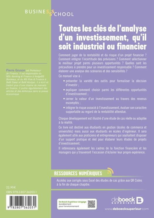 Ce livre est destiné aux étudiants en gestion (écoles de commerce et universités) mais aussi aux étudiants en écoles d’ingénieur. Il sera également utile aux praticiens et entrepreneurs qui souhaitent disposer d’un support pratique et réel pour élaborer leurs études de projets d’investissement.