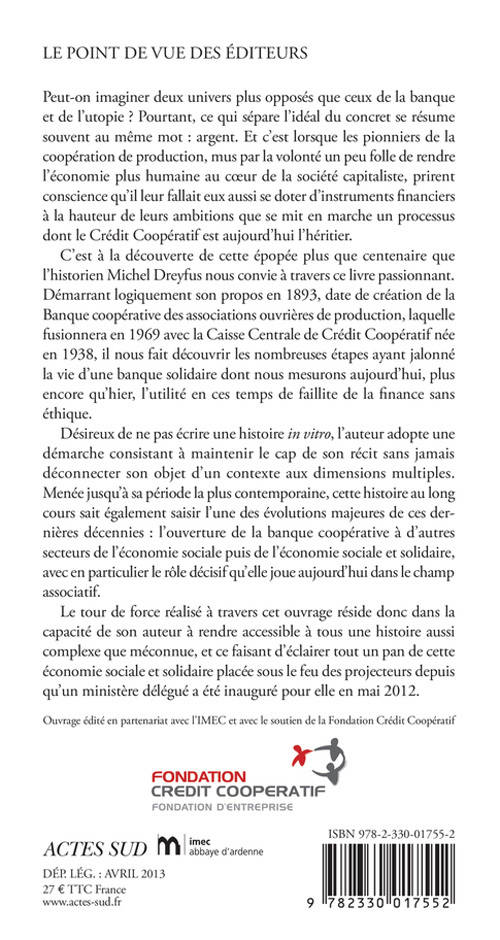 C'est à la découverte de cette épopée plus que centenaire que l'historien Michel Dreyfus nous convie à travers ce livre passionnant. Démarrant logiquement son propos en 1893, date de création de la Banque coopérative des associations ouvrières de production, laquelle fusionnera en 1969 avec la Caisse Centrale de Crédit Coopératif née en 1938, il nous fait découvrir les nombreuses étapes ayant jalonné la vie d'une banque solidaire dont nous mesurons aujourd'hui, plus encore qu'hier, l'utilité en ces temps de faillite de la finance sans éthique.