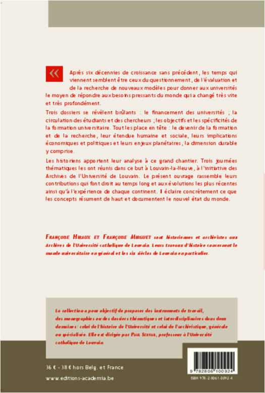 Après six décennies de croissance, les temps semblent être ceux du questionnement, de l'évaluation et de la recherche de nouveaux modèles pour les universités. Trois dossiers se révèlent brûlants : le financement des universités ; la circulation des étudiants et des chercheurs ; les objectifs et les spécificités de la formation universitaire. Les historiens apportent leur analyse à ce grand chantier, faisant droit au temps long et aux évolutions les plus récentes ainsi qu'à l'expérience de chaque continent.