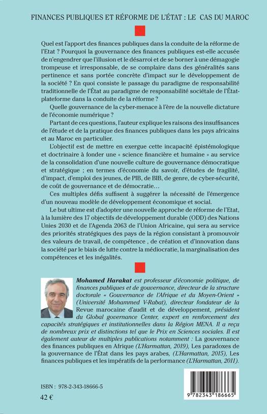 Quel est l'apport des finances publiques dans la conduite de la réforme de l'Etat ? Pourquoi la gouvernance des finances publiques est-elle accusée de se complaire dans des généralités sans pertinence et sans portée concrète d'impact sur le développement de la société ? En quoi consiste le passage du paradigme de responsabilité traditionnelle de l'État au paradigme de responsabilité sociétale de l'État-plateforme dans la conduite de la réforme ? Partant de ces questions, l'auteur explique les raisons des insuffisances de l'étude et de la pratique des finances publiques dans les pays africains et au Maroc en particulier. Le but ultime est d'adopter une nouvelle approche de réforme de l'Etat, à la lumière des 17 objectifs de développement durable (ODD) des Nations Unies 2030 et de l'Agenda 2063 de l'Union Africaine.