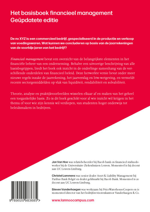 De nv XYZ is een commercieel bedrijf, gespecialiseerd in de productie en verkoop van voedingswaren. Wat kunnen we concluderen op basis van de jaarrekeningen van de voorbije jaren van het bedrijf? Financieel management bevat een overzicht van de belangrijkste elementen in het financiële beheer van een onderneming. Behalve een uitvoerige beschrijving van alle basisbegrippen, biedt het boek ook inzicht in de onderlinge samenhang van de verschillende onderdelen van financieel beleid. Deze herwerkte versie bevat onder meer nieuwe regels inzake de jaarrekening, het jaarverslag en btw-wetgeving, en vermeldt recente sectorgemiddelden op vlak van liquiditeit, rendabiliteit en solvabiliteit. Theorie, analyse en praktijkvoorbeelden wisselen elkaar af en maken van het geheel een toegankelijke basis. Zo is dit boek geschikt voor al wie inzicht wil krijgen in het thema of voor wie zijn kennis wil verdiepen, van studenten hoger onderwijs tot beleidsmakers in bedrijven.