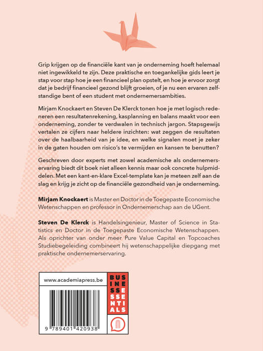 Mirjam Knockaert, professor Ondernemerschap, en Steven De Klerck, ervaren ondernemer en academicus, tonen hoe je met logisch redeneren een resultatenrekening, kasplanning en balans maakt voor een onderneming, zonder te verdwalen in technisch jargon. Stapsgewijs vertalen ze cijfers naar heldere inzichten: wat zeggen de resultaten over de haalbaarheid van je idee, en welke signalen moet je zeker in de gaten houden om risico's te vermijden en kansen te benutten?