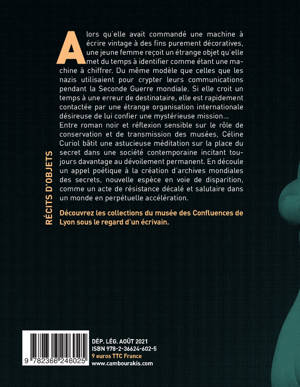 3e texte de la collection "Récits d'objets", en coédition avec le musée des Confluences. A partir d'une machine à chiffrer (semblable à celle utilisée par les nazis pour crypter leurs échanges finalement décodés entre autres par Alan Turing) reçue par erreur par une jeune femme se retrouvant missionnée par de hautes instances internationales, Céline Curiol bâtit un facétieux roman noir en même temps qu'une réflexion sur la place des secrets, fortement menacés dans la société contemporaine incitant au dévoilement permanent.