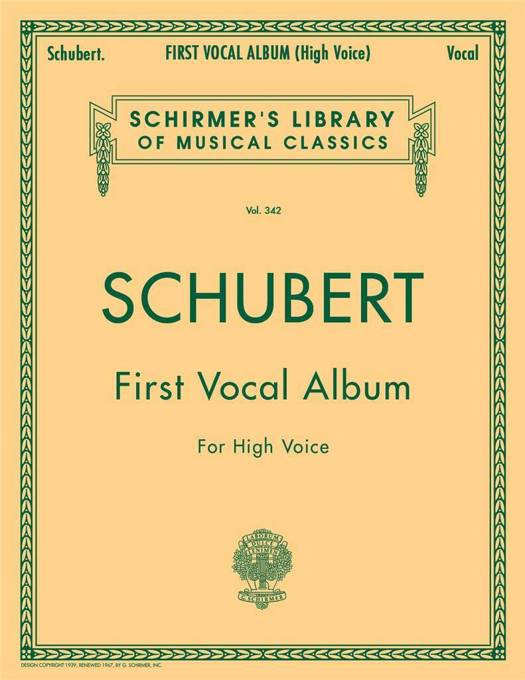 (Vocal Collection). Contents: Afar * After Work * Angel of Beauty * Atlas * Ave Maria * Benumbed * The Brook's Lullaby * By the Sea * The Carrier-Pigeon * Courage * Death and the Maiden * The Double * The Erlking * Faith in Spring * Farewell, Our Love to Sever * The Favorite Color * The Fishermaiden * Frozen Tears * Good Night * The Gray Head * The Guide-Post * Halt by the Brook * Hark! Hark! the Lark * The Hateful Color * Hedge Rose * Her Portrait * The Hunter * Huntsman's Even Song * Illusion * In the Village * Jealousy and Pride * The Last Hope * The Linden Tree * Longing for Spring * Looking Backward * Love's Message * The Maiden's Lament * Margaret at the Spinning-Wheel * Mignon's Song * The Miller and the Brook * The Miller's Flowers * Mine * The Mock Suns * Morning Greeting * My Abode * My Sweet Repose(Du Bist Die Ruh) * On the River * The Organ Player * Parting * Pause * The Post * Praise of Tears * The Question * The Raven * Rest * Restless Love * Romance (Rosamund) * The Secret * Serenade * The Shepherd's Lament * Solitude * Spring Dreams * The Stormy Morning * Teardrops * Thanks to the Brook * To Be Sung on the Waters * The Town * The Trout * Ungeduld (Impatience) * The Vane * The Wanderer * Wanderer's Night-Song * Wandering * Warrior's Foreboding * The Water-Course * The Wayside Inn * Whither? * Who is Sylvia * Will O' the Wisp * With the Green Lute-Band * Withered Flowers * The Young Nun.