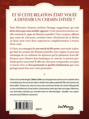 Ce livre, accompagné de son oracle de 18 cartes, vous invite à plonger dans les arcanes des flammes jumelles : leur origine, le parcours initiatique de ces relations, les épreuves qui les jalonnent, leurs différences avec d’autres liens karmiques et, surtout, la mission profonde qui les sous-tend. Il offre des clés pour comprendre, accepter et mieux vivre ce lien passionné et parfois douloureux que vous partagez peut-être avec votre partenaire.