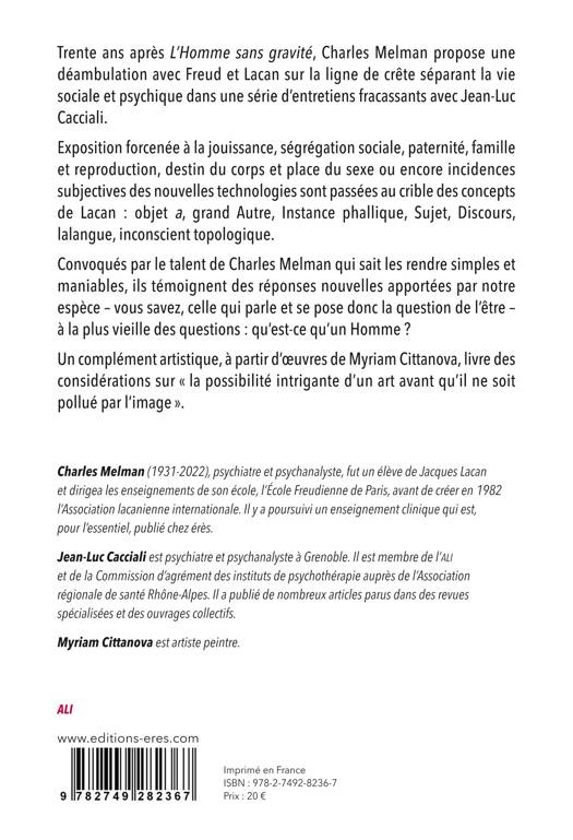 Trente ans après L'Homme sans gravité, Charles Melman propose une déambulation avec Freud et Lacan sur la ligne de crête séparant la vie sociale et psychique dans une série d'entretiens fracassants avec Jean-Luc Cacciali.
