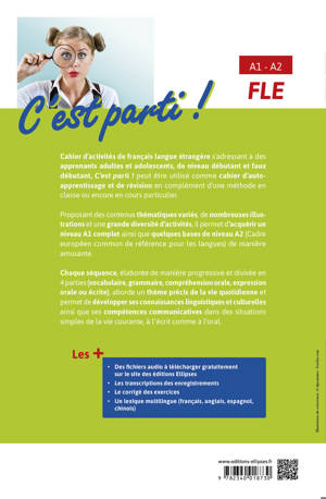 Cahier d’activités de français langue étrangère s’adressant à des apprenants adultes et adolescents, de niveau débutant et faux débutant, C’est parti ! peut être utilisé comme cahier d’autoapprentissage et de révision en complément d’une méthode en classe ou encore en cours particulier.