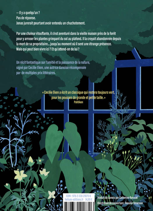 Jonas aime passer du temps dans son repaire caché au fond du jardin luxuriant d'une vieille dame... Quand celle-ci décède, en pleine canicule, il s'inquiète du devenir de ses plantes. Mais à l'intérieur de la maison, également gagné par la végétation, il devine une étrange présence... À travers l'amitié atypique d'un jeune garçon et d'une petite fille-plante, l'autrice met en place, dans une langue simple, une ambiance intrigante, pleine de suspense, qui rend hommage à la beauté et à la puissance du règne végétal. Un roman fantastique sur l'amitié et la puissance de la nature, signé par une autrice danoise primée à de multiples reprises.