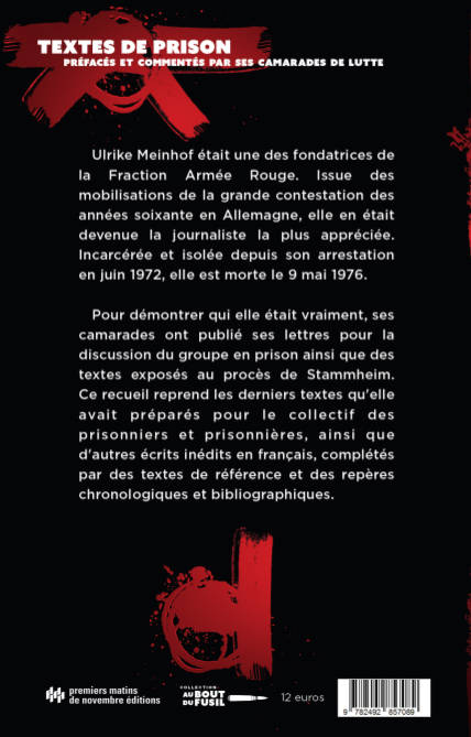 Ulrike Meinhof était une des fondatrices de la Fraction Armée Rouge. Issue des mobilisations de la grande contestation des années soixante en Allemagne, elle en était devenue la journaliste la plus appréciée. Incarcérée et isolée depuis son arrestation en juin 1972, elle est morte le 9 mai 1976. Pour démontrer qui elle était vraiment, ses camarades ont publié ses lettres pour la discussion du groupe en prison ainsi que des textes exposés au procès de Stammheim. Ce recueil reprend les derniers textes qu'elle avait préparés pour le collectif des prisonniers et prisonnières, ainsi que d'autres écrits inédits en français, complétés par des textes de référence et des repères chronologiques et bibliographiques.