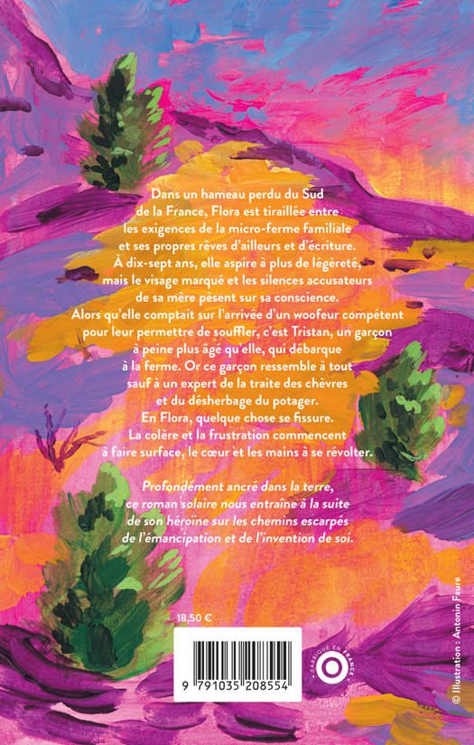 Dans un hameau perdu du Sud de la France, Flora est tiraillée entre les exigences de la micro-ferme familiale et ses propres rêves d'ailleurs et d'écriture. À dix-sept ans, elle aspire à plus de légèreté, mais le visage marqué et les silences accusateurs de sa mère pèsent sur sa conscience. Alors qu'elle comptait sur l'arrivée d'un woofeur compétent pour leur permettre de souffler, c'est Tristan, un garçon à peine plus âgé qu'elle, qui débarque à la ferme. Or ce garçon ressemble à tout sauf à un expert de la traite des chèvres et du désherbage du potager. En Flora, quelque chose se fissure. La colère et la frustration commencent à faire surface, le coeur et les mains à se révolter. Profondément ancré dans la terre, ce roman solaire nous entraîne à la suite de son héroïne sur les chemins escarpés de l'émancipation et de l'invention de soi.