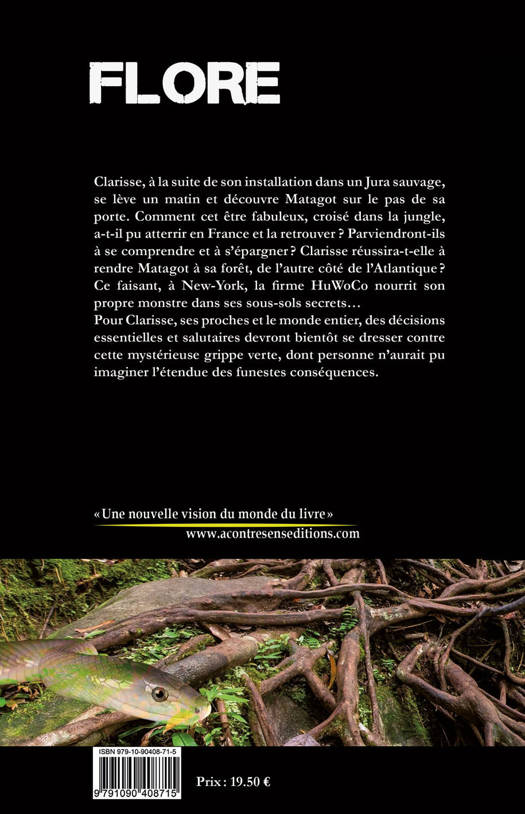 Résumé : Clarisse, à la suite de son installation dans un Jura sauvage, se lève un matin et découvre Matagot sur le pas de sa porte. Comment cet être fabuleux, croisé dans la jungle, a-t-il pu atterrir en France et la retrouver ? Parviendront-ils à se comprendre et à s’épargner ? Clarisse réussira-t-elle à rendre Matagot à sa forêt, de l’autre côté de l’Atlantique ? Ce faisant, à New-York, la firme HuWoCo nourrit son propre monstre dans ses sous-sols secrets… Pour Clarisse, ses proches et le monde entier, des décisions essentielles et salutaires devront bientôt se dresser contre une mystérieuse grippe verte, dont personne ne peut imaginer l’étendue de ses funestes conséquences.