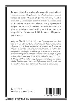 La jeune Elisabeth se rend au laboratoire d'anatomie afin de vendre son corps. Elle précise : "On m'a dit qu'ici, on pouvait vendre son corps. Absolument. Je veux dire que, quand je serai morte, ces messieurs pourront faire de mon cadavre ce qu'ils voudront, au profit de la science… Sauf que je toucherai l'argent tout de suite. Maintenant." Ainsi commence cette pièce, sous-titrée par Horvath : Une petite dans de mort en cinq tableaux. Et pourtant, la Foi, l'Amour et l'Espérance sont tenaces…