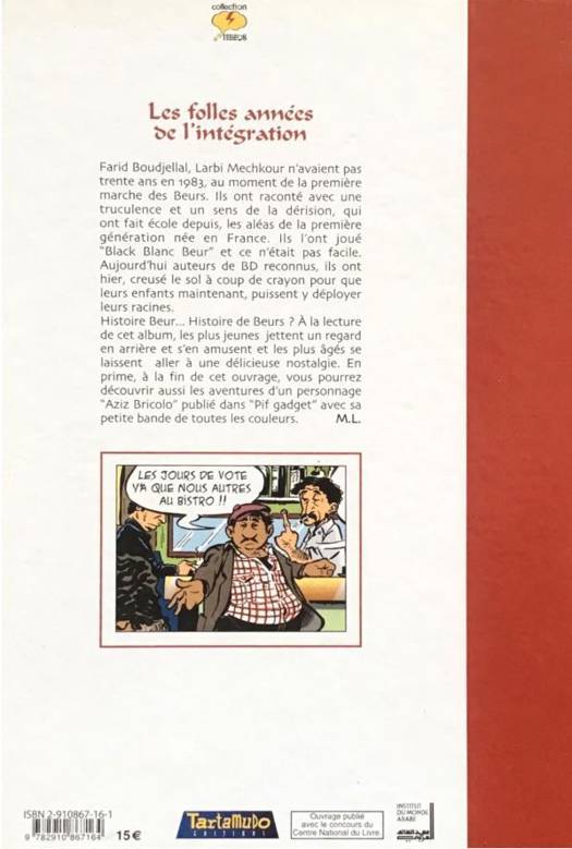 Farid Boudjellal, Larbi Mechkour n'avaient pas trente ans en 1983, au moment de la première marche des Beurs. Ils ont raconté avec une truculence et un sens de la dérision, qui ont fait école depuis, les aléas de la première génération née en France. Ils l'ont joué Black Blanc Beur et ce n'était pas facile. Aujourd'hui auteurs de BD reconnus, ils ont hier, creusé le sol à coup de crayon pour que leurs enfants maintenant, puissent y déployer leurs racines. Histoire Beur... Histoire de Beurs ? A la lecture de cet album, les plus jeunes jettent un regard en arrière et s'en amusent et les plus âgés se laissent aller à une délicieuse nostalgie. En prime, à la fin de cet ouvrage, vous pourrez découvrir aussi les aventures d'un personnage Aziz Bricolo publié dans Pif gadget avec sa petite bande de toutes les couleurs.