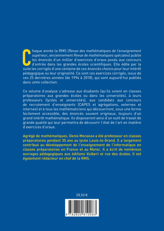 Chaque année la RMS (Revue des mathématiques de l'enseignement supérieur, anciennement Revue de mathématiques spéciales) publie les énoncés d'un millier d'exercices d'oraux posés aux concours d'entrée dans les grandes écoles scientifiques. Elle édite par la suite les corrigés d'une centaine de ces énoncés choisis pour leur intérêt pédagogique ou leur originalité. Ce sont ces exercices corrigés, issus de ces 25 dernières années (de 1994 à 2018), qui sont aujourd'hui publiés dans cette collection.