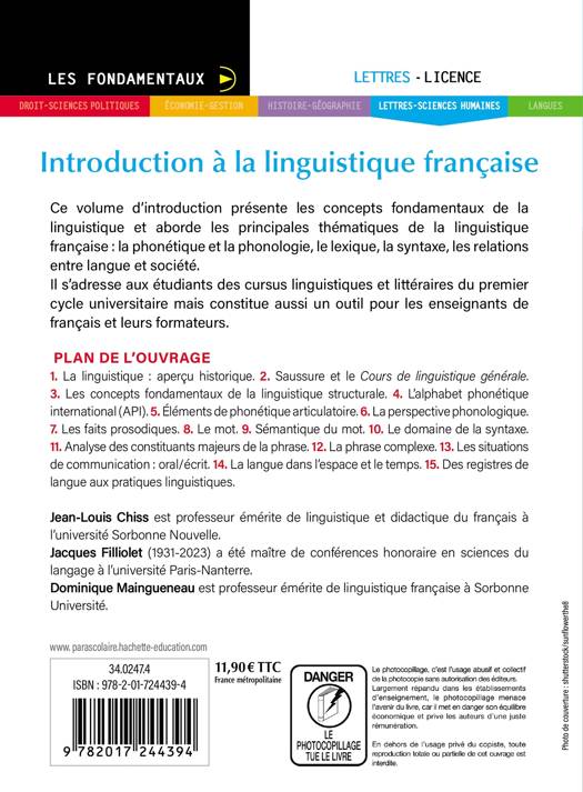 PLAN DE L’OUVRAGE : 1. La linguistique : aperçu historique. 2. Saussure et le Cours de linguistique générale. 3. Les concepts fondamentaux de la linguistique structurale. 4. L’alphabet phonétique international (API). 5. Éléments de phonétique articulatoire. 6. La perspective phonologique. 7. Les faits prosodiques. 8. Le mot. 9. Sémantique du mot. 10. Le domaine de la syntaxe. 11. Analyse des constituants majeurs de la phrase. 12. La phrase complexe. 13. Les situations de communication : oral/écrit. 14. La langue dans l’espace et le temps. 15. Des registres de langue aux pratiques linguistiques.
