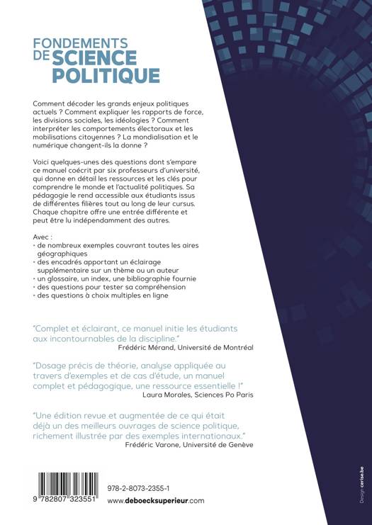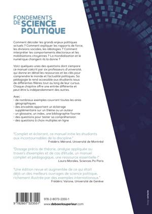 Voici quelques-unes des questions dont s’empare ce manuel coécrit par six professeurs d’université, qui donne en détail les ressources et les clés pour comprendre le monde et l’actualité politiques. Sa pédagogie le rend accessible aux étudiants issus de différentes filières tout au long de leur cursus. Chaque chapitre offre une entrée différente et peut être lu indépendamment des autres.