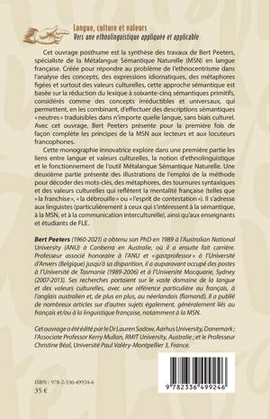 Cet ouvrage posthume est la synthèse des travaux de Bert Peeters, spécialiste de la Métalangue Sémantique Naturelle (MSN) en langue française. Créée pour répondre au problème de l'ethnocentrisme dans l'analyse des concepts, des expressions idiomatiques, des métaphores figées et surtout des valeurs culturelles, cette approche sémantique est basée sur la réduction du lexique à soixante-cinq sémantiques primitifs, considérés comme des concepts irréductibles et universaux, qui permettent, en les combinant, d'effectuer des descriptions sémantiques neutres traduisibles dans n'importe quelle langue, sans biais culturel. Avec cet ouvrage, Bert Peeters présente pour la première fois de façon complète les principes de la MSN aux lecteurs et aux locuteurs francophones.