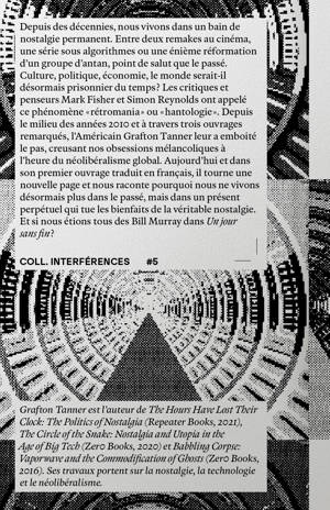 Depuis des décennies nous vivons dans un bain de nostalgie permanent. Entre deux remakes au cinéma, une série sous algorithmes ou une énième réformation d’un groupe d’antan, point de salut que le passé. Culture, politique, économie, le monde serait-il donc désormais prisonnier du temps ? Les critiques et penseurs Mark Fisher et Simon Reynolds ont appelé ça « Rétromania » ou « hauntologie ». Depuis le milieu des années 2010 et à travers trois ouvrages remarqués, l’américain Grafton Tanner leur a emboité le pas, creusant nos obsessions mélancoliques à l’heure du néolibéralisme global. Aujourd’hui et dans son premier ouvrage traduit en français, il tourne une nouvelle page et nous raconte pourquoi nous ne vivons désormais plus dans le passé, mais dans un présent perpétuel qui tue les bienfaits de la véritable nostalgie. Et si nous étions tous des Bill Murray dans Un jour sans fin ?
