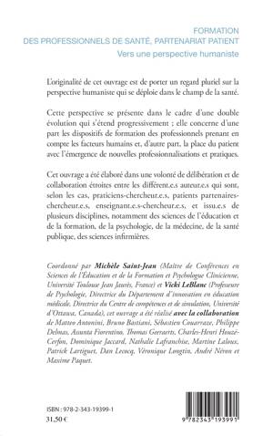 L'originalité de cet ouvrage est de porter un regard pluriel sur la perspective humaniste qui se déploie dans le champ de la santé. Cette perspective se présente dans le cadre d'une double évolution qui s'étend progressivement ; elle concerne d'une part les dispositifs de formation des professionnels prenant en compte les facteurs humains et, d'autre part, la place du patient avec l'émergence de nouvelles professionnalisations et pratiques.