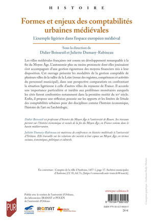 Les villes médiévales françaises ont connu un développement remarquable à la fin du Moyen Âge. L’autonomie plus ou moins prononcée dont elles jouissaient s’est accompagnée d’une gestion rigoureuse des moyens financiers mis à leur disposition. Cet ouvrage présente les modalités de la gestion comptable de plusieurs villes de la vallée de la Loire (tenue des registres, compétences et activités du personnel municipal), dans une perspective comparatiste en confrontant la situation ligérienne à celle d’autres villes du royaume de France. Il accorde une importance particulière et inédite aux problèmes monétaires auxquels les cités furent confrontées notamment dans la première moitié du XVe siècle. Enfin, il propose une réflexion poussée sur les apports et les limites de l’étude des comptabilités urbaines pour des disciplines comme l’histoire économique, l’histoire de l’art ou l’archéologie.