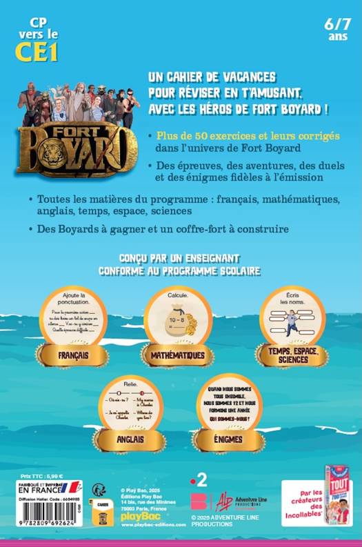 · Plus de 50 exercices et leurs corrigés dans l’univers de Fort Boyard. · Des épreuves, des aventures, des duels et des énigmes… fidèles à l’émission. · Toutes les matières du programme : français, mathématiques, histoire-géographie, sciences et anglais. · Des Boyards à gagner et un coffre-fort à construire… · Conforme au programme scolaire et conçu par des enseignants !