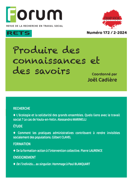 – Celui inhérent aux connaissances et savoirs produits par le traitement de problématiques sociales pertinentes au champ social et utiles à l’action des praticiens sociaux.