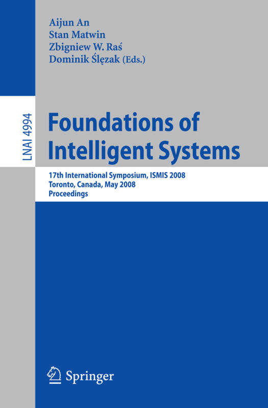 This volume contains the papers selected for presentation at the 17th Inter- tional Symposium on Methodologies for Intelligent Systems (ISMIS 2008), held in York University, Toronto, Canada, May 21-23, 2008. ISMIS is a conference series started in 1986. Held twice every three years, ISMIS provides an inter- tional forum for exchanging scienti?c research and technological achievements in building intelligent systems. Its goal is to achieve a vibrant interchange - tween researchers and practitioners on fundamental and advanced issues related to intelligent systems. ISMIS 2008featureda selectionof latestresearchworkandapplicationsfrom the following areas related to intelligent systems: active media human-computer interaction, autonomic and evolutionary computation, digital libraries, intel- gent agent technology, intelligent information retrieval, intelligent information systems, intelligent language processing, knowledge representation and integ- tion, knowledge discovery and data mining, knowledge visualization, logic for arti?cial intelligence, soft computing, Web intelligence, and Web services. - searchers and developers from 29 countries submitted more than 100 full - pers to the conference. Each paper was rigorously reviewed by three committee members and external reviewers. Out of these submissions, 40% were selected as regular papers and 22% as short papers. ISMIS 2008 also featured three plenary talks given by John Mylopoulos, Jiawei Han and Michael Lowry. They spoke on their recent research in age- oriented software engineering, information network mining, and intelligent so- ware engineering tools, respectively.