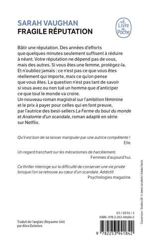 Bâtir une réputation. Des années d’efforts que quelques minutes seulement suffisent à réduire à néant. Votre réputation ne dépend pas de vous, mais des autres. Si vous êtes une femme, protégez-la. Et n’oubliez jamais : ce n’est pas ce que vous êtes réellement qui importe, mais ce qu’on pense que vous êtes. La question n’est pas tant de savoir si vous avez ou non tué un homme que d’anticiper ce que tout le monde va croire. Un nouveau roman magistral sur l’ambition féminine et le prix à payer pour celles qui en font preuve, par l’autrice des best-sellers La Ferme du bout du monde et Anatomie d’un scandale, roman adapté en série sur Netflix.