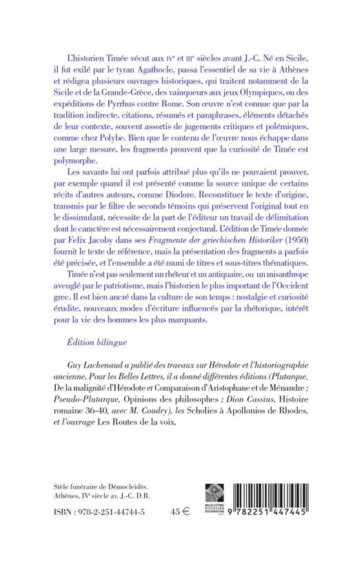 L'historien Timee vecut aux IVe et IIIe siecles avant J.-C. Ne en Sicile, il fut exile par le tyran Agathocle, passa l'essentiel de sa vie a Athenes et redigea plusieurs ouvrages historiques, qui traitent notamment de la Sicile et de la Grande-Grece, des vainqueurs aux jeux Olympiques, ou des expeditions de Pyrrhus contre Rome. Son oeuvre n'est connue que par la tradition indirecte, citations, resumes et paraphrases, elements detaches de leur contexte, souvent assortis de jugements critiques et polemiques, comme chez Polybe. Bien que le contenu de l'oeuvre nous echappe dans une large mesure, les fragments prouvent que la curiosite de Timee est polymorphe. Les savants lui ont parfois attribue plus qu'ils ne pouvaient prouver, par exemple quand il est presente comme la source unique de certains recits d'autres auteurs, comme Diodore. Reconstituer le texte d'origine, transmis par le filtre de seconds temoins qui preservent l'original tout en le dissimulant, necessite de la part de l'editeur un travail de delimitation dont le caractere est necessairement conjectural. L'edition de Timee donnee par Felix Jacoby dans ses Fragmente der griechischen Historiker (1950) fournit le texte de reference, mais la presentation des fragments a parfois ete precisee, et l'ensemble a ete muni de titres et sous-titres thematiques. Timee n'est pas seulement un rheteur et un antiquaire, ou un misanthrope aveugle par le patriotisme, mais l'historien le plus important de l'Occident grec. Il est bien ancre dans la culture de son temps: nostalgie et curiosite erudite, nouveaux modes d'ecriture influences par la rhetorique, interet pour la vie des hommes les plus marquants.