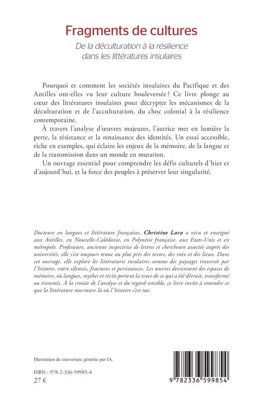 Pourquoi et comment les sociétés insulaires du Pacifique et des Antilles ont-elles vu leur culture bouleversée ? Ce livre plonge au coeur des littératures insulaires pour décrypter les mécanismes de la déculturation et de l'acculturation, du choc colonial à la résilience contemporaine. À travers l'analyse d'oeuvres majeures, l'autrice met en lumière la perte, la résistance et la renaissance des identités. Un essai accessible, riche en exemples, qui éclaire les enjeux de la mémoire, de la langue et de la transmission dans un monde en mutation. Un ouvrage essentiel pour comprendre les défis culturels d'hier et d'aujourd'hui, et la force des peuples à préserver leur singularité.