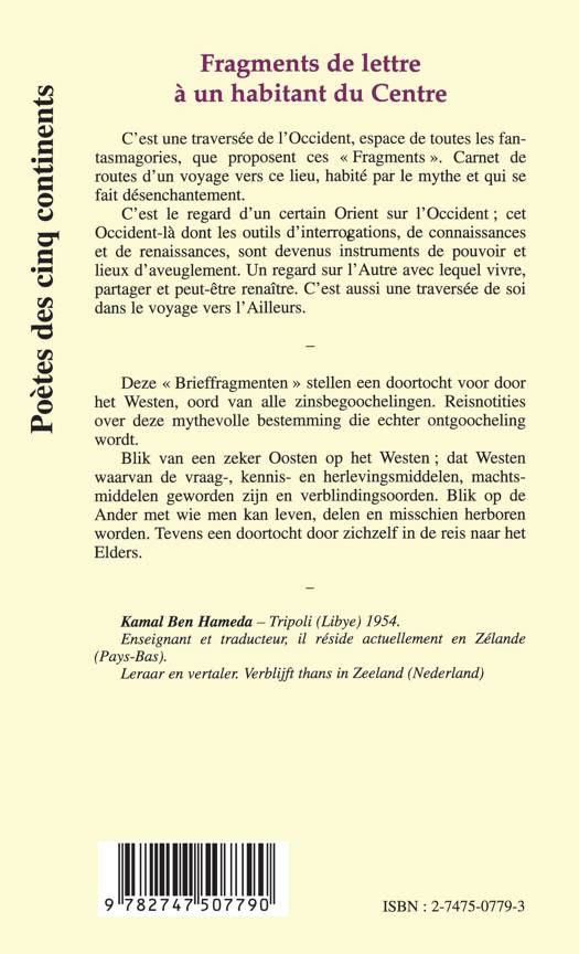 C'est le regard d'un certain Orient sur l'Occident ; cet Occident-là dont les outils d'interrogations, de connaissances et de renaissances, sont devenus instruments de pouvoir et lieux d'aveuglement. Un regard sur l'Autre avec lequel vivre, partager et peut-être renaître. Avec ce deuxième recueil, l'auteur confirme cette traversée de soi dans la voyage vers l'Ailleurs. Bilingue Français/Néerlandais Kamal BEN HAMEDA - Tripoli (Libye) 1954. Enseignant et traducteur, il réside actuellement en Zélande (Pays-Bas).