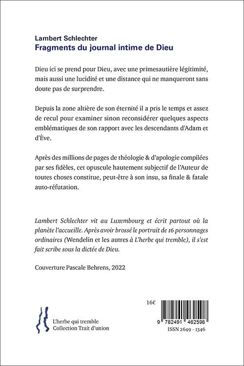 Dieu ici se prend pour Dieu, avec une primesautière légitimité, mais aussi une lucidité et une distance qui ne manqueront sans doute pas de surprendre.