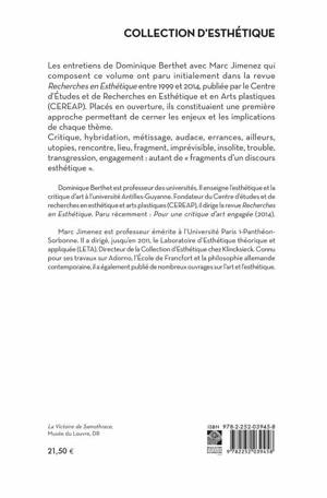 English summary: Dominique Berthets interviews with Marc Jimenez first appeared in Recherches en Esthetique between 1999 and 2014, published by the Center for Study and Research in Esthetics and the Arts. Intended as an introduction for each volume, they treat themes as varied as hybridization, utopias, place, transgression, and many other fragments of esthetic discourse. French description: Les entretiens de Dominique Berthet avec Marc Jimenez qui composent ce volume ont paru initialement dans la revue Recherches en Esthetique entre 1999 et 2014, publiee par le Centre d'Etudes et de Recherches en Esthetique et en Arts plastiques (CEREAP). Places en ouverture, ils constituaient une premiere approche permettant de cerner les enjeux et les implications de chaque theme.Critique, hybridation, metissage, audace, errances, ailleurs, utopies, rencontre, lieu, fragment, imprevisible, insolite, trouble, transgression, engagement: autant de fragments d'un discours esthetique .