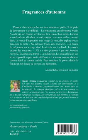 L’amour, chez notre poète, est sain, comme sa poésie. Il est plein de dévouement et de¬ fidélité... Le romantisme que développe Marín Aranda suit son chemin avec les vers de la femme bien-aimée. L’amour se confond avec elle dans un seul concept, une seule ombre, un seul désir. La source d’inspiration a un visage. La sensualité explose avec sa dynamite de mots. «J’ai tellement trouvé dans ta bouche !» La beauté du crépuscule sur le corps aimé. La victoire sur la solitude. Le monde unique des amoureux. « S’il y a deux personnes / qui sont heureuses ensemble / les autres sont de trop». La mélancolie. Les seins et la lune. Les lèvres engourdies après avoir fait l’amour. La femme comme chemin, comme idéal et comme arrivée. Pour conclure, le poète admire la femme et met l’ordre de ses vers à sa disposition. - Manuel Juliá, écrivain et journaliste.