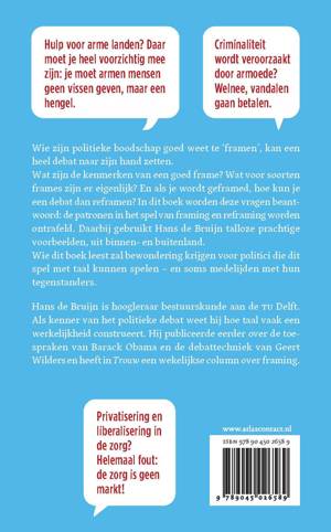 Wie zijn politieke boodschap intelligent kan verpakken, kan de werkelijkheid naar zijn hand zetten laat Hans de Bruijn zien in dit vlijmscherpe boek. Hij legt uit hoe framing werkt en geeft een overzicht van verschillende strategieën, met prachtige voorbeelden - de frames van Ronald Reagan en Bill Clinton, van Mark Rutte en Diederik Samsom, van Margaret Thatcher en Angela Merkel: ze komen allemaal voorbij. Framing is veel meer dan slim taalgebruik. Het gaat om de vraag hoe je als politicus de essentie kunt verwoorden van waar je mee bezig bent - en dat is in onze samenleving een bittere noodzaak geworden.
