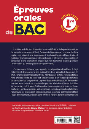 Cet ouvrage a été conçu pour guider la préparation des élèves. Il s’agit notamment de montrer le lien qui unit les deux aspects de l’épreuve. En effet, l’analyse grammaticale offre de nombreuses pistes à l’interprétation. Ainsi chaque étude de texte est-elle précédée d’un rappel grammatical sur une partie du programme. Le point de grammaire est suivi d’un entraînement à des questions potentielles portant à la fois sur l’objet étudié et sur des points précédents. Sur le modèle des exemples proposés, les futurs bacheliers sont encouragés à réinvestir ces connaissances dans la lecture. Par ailleurs, les textes sont choisis pour leur caractère patrimonial et font l’objet d’une contextualisation pour offrir des repères dans l’histoire littéraire.
