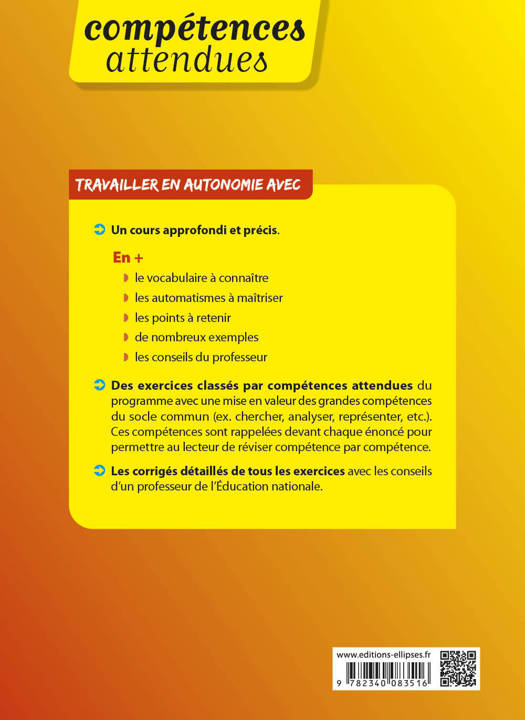 Des exercices classés par compétences attendues du programme avec une mise en valeur des grandes compétences du socle commun. Ces compétences sont rappelées devant chaque énoncé pour permettre au lecteur de réviser compétence par compétence.