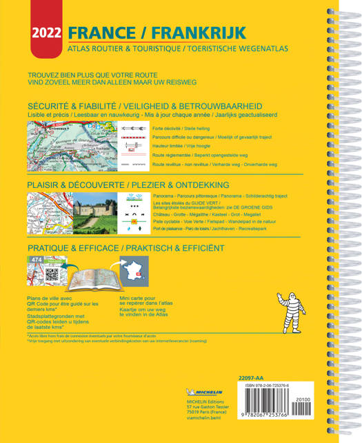 Wegenatlas Frankrijk 2022 met de bekende kaarten van Michelin in A4- formaat in stevige ringband. Uiterst goede kaarten met veel informatie, o.a. de groene lijnen langs wegen die echt mooi zijn. Ideaal voor de vakantie!De Michelin Wegenatlas van Frankrijk is een gedetailleerde wegenatlas en biedt kaarten op schaal 1:200.000 (1cm = 2 km) op A4 formaat. Met uitgebreide legenda en plaatsnamenindex. Ringband uitvoering- Jaareditie. Met flitspalen, 75 stadsplattegronden, kaarten van de grote verbindingswegen en bezienswaardigheden en mooie routes.De MICHELIN atlas, een onmisbare reisgezel om de juiste weg te vinden en een bepaald geografisch gebied te ontdekken.