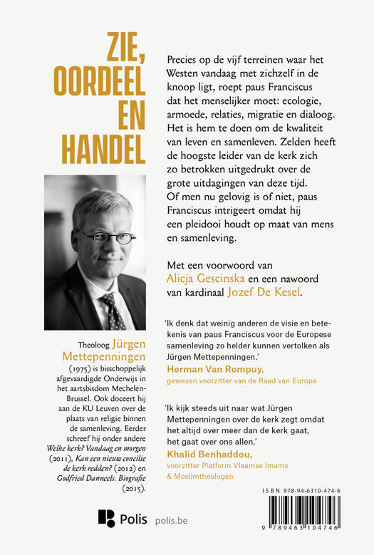 Precies op de vijf terreinen waar het Westen vandaag in de knoop ligt met zichzelf roept paus Franciscus voor ieder die het horen wil dat het menselijker moet: ecologie, armoede, relaties, migratie en dialoog. Het is hem daarbij te doen om de kwaliteit van het leven en samenleven van allen. Zelden heeft de hoogste leider van de kerk zich zo betrokken uitgedrukt over de grote uitdagingen van zijn tijd. In dit boek wordt Franciscus’ visie op deze vijf punten helder weergegeven en gebundeld, gevolgd door een stevig pleidooi van Jürgen Mettepenningen dat we Franciscus’ visie maar beter ernstig kunnen nemen. Mettepenningen schrijft dit boek vanuit de overtuiging dat Franciscus’ woorden relevantie hebben en daardoor van betekenis zijn voor de toekomst van onze samenleving, omwille van de samenleving. Of men nu gelovig is of niet, de paus intrigeert allen omdat hij inspireert op de maat van mens en samenleving. Zie, oordeel en handel.