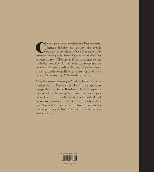 Connu pour avoir révolutionné l’art équestre, François Baucher est l’un des plus grands écuyers du XIXe siècle. « Doué d’un esprit d’observation remarquable, favorisé par la nature d’un tact extraordinaire » (L’Hotte), il brilla au cirque où ses méthodes novatrices lui permirent de rencontrer un véritable triomphe. Adulé par les uns, haï par les autres, il suscita d’ardentes polémiques et son opposition au comte d’Aure marquera l’histoire de l’art équestre. Magnifiquement illustré par Marine Oussedik, artiste passionnée par l’univers du cheval, l’ouvrage nous plonge dans la vie de Baucher et le Paris équestre du XIXe siècle. Année après année, il retrace le parcours du maître et la mise au point de sa méthode qui connut un immense succès. À travers l’analyse de la première et de la deuxième manière, il présente les grands principes du bauchérisme et la pensée de son célèbre auteur.