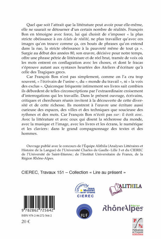 Constributions à des rencontres internationales sur l'oeuvre de François Bon, le rapport à soi, aux autres et à l'histoire sociale dans son oeuvre, son rôle dans le retour, à partir des années 1980, du questionnement sur le réel et ses représentations dans le champ de la littérature, etc.