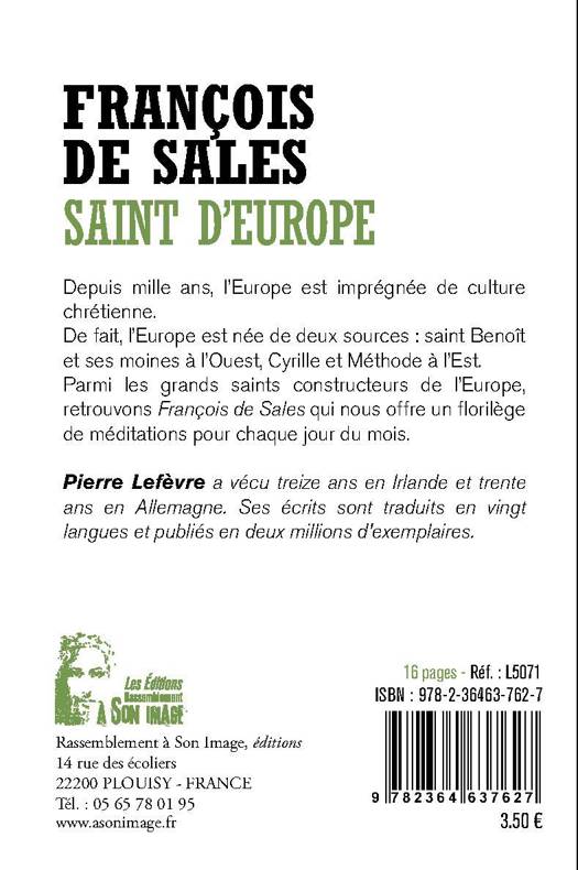 François de Sales Saint d'Europe Depuis mille ans, l'Europe est imprégnée de culture chrétienne. De fait, l'Europe est née de deux sources : saint Benoît et ses moines à l'Ouest, Cyrille et Méthode à l'Est. Parmi les grands saints constructeurs de l'Europe, retrouvons François de Sales qui nous offre un florilège de méditations pour chaque jour du mois.
