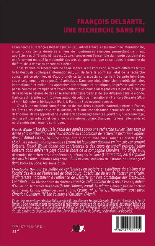 La recherche sur François Delsarte (1811-1871), artiste français à la renommée internationale, a connu ces trente dernières années de nombreuses avancées permettant de mieux apprécier ses différents héritages. Ceux-ci ont fortement marqué la modernité des arts du spectacle, dans le domaine du théâtre, de la danse et du cinéma. 2011, l'année du bicentenaire de sa naissance a été l'occasion, par le biais de festivals, colloques internationaux, d'approfondir certains aspects concernant Delsarte lui-même, ses enseignements et sa postérité artistique.