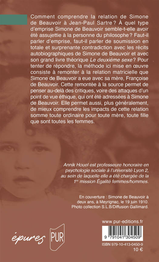 Comment comprendre la relation de Simone de Beauvoir à Jean-Paul Sartre ? À quel type d’emprise Simone de Beauvoir semble-t-elle avoir été assujettie à la personne du philosophe ? Faut-il parler d’emprise, faut-il parler de soumission en totale et surprenante contradiction avec les récits autobiographiques de Simone de Beauvoir et avec son grand livre théorique Le deuxième sexe ? Pour tenter de répondre, la méthode ici mise en oeuvre consiste à remonter à la relation matricielle que Simone de Beauvoir a eue avec sa mère, Françoise de Beauvoir. Cette remontée à la source permet de penser au-delà des critiques, voire des attaques d’un point de vue éthique, qui ont été adressées à Simone de Beauvoir. Elle permet aussi, plus généralement, de mieux comprendre les impacts de cette relation somme toute ordinaire pour toute mère, toute fille que sont toutes les femmes.