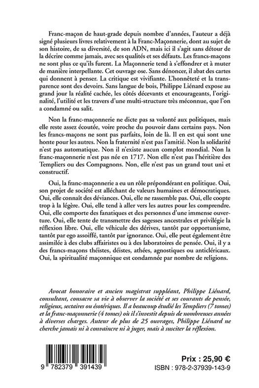Sans langue de bois, Philippe Liénard expose au grand jour laréalité cachée, les côtés décevants et encourageants, l’originalité, l’utilitéet les travers d’une multi-structure très méconnue, que l’on a condamnée ousalie. Elle n’est ni unie, ni née en 1717, ni héritière des Templiers ou desCompagnons. Elle n’est ni un gouvernement occulte ni une mouvance que l’on neconsulte pas. Presque toutes les religions la condamnent. A tort ou à raison? Franc-maçon de haut-grade en Europe depuis nombre d’années,l’auteur a déjà signé plusieurs livres relativement à la Franc-Maçonnerie, dontau sujet de son histoire, de sa diversité, de son ADN, mais ici il s’agit sansdétour de la décrire comme jamais, avec ses qualités et ses défauts. Lesfrancs-maçons ne sont plus ce qu’ils furent. La Maçonnerie tend à s’effondrer età muter de manière interpellante. Cet ouvrage ose. Sans dénoncer, il abat descartes qui donnent à penser. La critique est vivifiante. L’honnêteté et latransparence sont des devoirs. Très rares sont lesouvrages concernant la franc-maçonnerie qui ne comportent pas de symbolisme oud’étude sur les rites ou son histoire. Certes, certains livres relèvent defausses révélations ou d’une agressivité. D’autres s’interrogent. D’autresencore décortiquent les rituels à l’usage des francs-maçons afin de leurfaciliter l’étude de leurs outils, symboles, instruments ou armes. A tousgrades. Cet ouvrage décrit ce qu’est la franc-maçonnerie dans lemonde, ce que font les francs-maçons ou ce qu’ils ne font ou ne sont pas. Ensoi, c’est une première, en version grand public, sans langue de bois, sans fauxfuyants. Points forts: Vérité historique - Lescoulisses de la franc-maçonnerie - La diversité maçonnique - La réalité desfrancs-maçons - Les tendances - l’influence maçonnique - Le fonctionnement d’uneloge - Maçonnerie et politique - Maçonnerie et société - Enfer ou progrès -L’évolution des loges - Absentéisme et désintérêt - Fraternité ou leurre -Solidarité ou compromission - Origines et vérités.Avocat honoraire et ancien magistrat suppléant, Philippe Liénard consacre sa vieà observer la société et ses courants de pensée, religieux, sectaires ouésotériques. Il a beaucoup étudié les Templiers (7 tomes) et la franc-maçonnerie(5 tomes) où il s’investit depuis de nombreuses années à diverses charges.Auteur de plus de 25 ouvrages, Philippe Liénard ne cherche jamais ni àconvaincre ni à juger, mais à susciter la réflexion. Disponible, il multiplieles conférences privées ou publiques avec succès depuis longtemps, en France, enBelgique ou ailleurs.