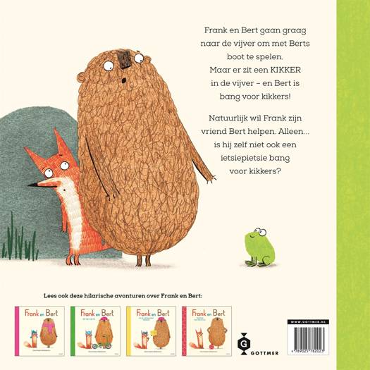 De beste vrienden Frank en Bert beleven weer een grappig avontuur, vol kikkers, vriendschap en het onder ogen zien van je angsten en moed. Frank en Bert houden ervan om met de speelgoedboot van Bert op de kleine vijver te zeilen. Maar - o nee! - er zit een KIKKER in de vijver. Bert is heel bang voor kikkers. Arme Bert! Gelukkig heeft hij zijn dappere vriend Frank bij zich... maar is Frank stiekem ook niet een béétje bang?